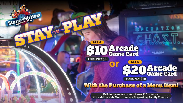 Our Stay N’ Play Combos are our best value! The perfect idea if you want to have a fun activity with family or friends but not really in the mood to sit at a boring restaurant. Come on down to Stars and Strikes, pick your dish and enjoy a $10 or $20 Arcade Game Card for one low price!