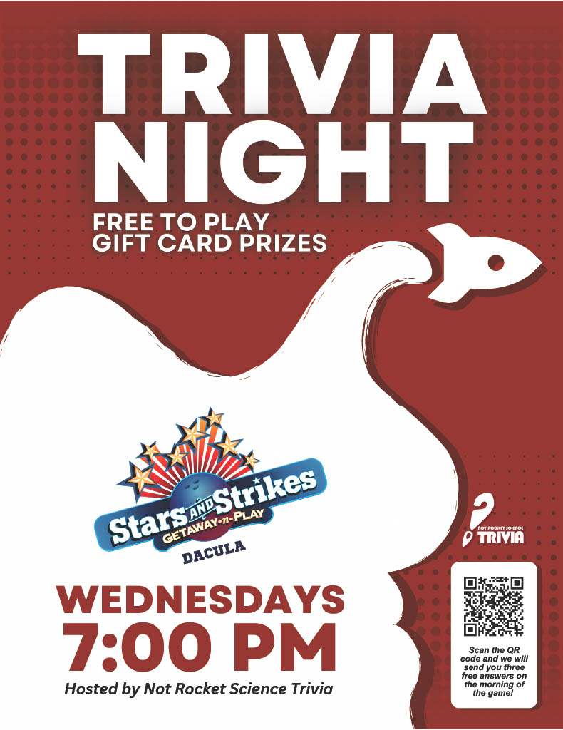 🧠Think you’ve got what it takes? Gather your crew and join us for Trivia Night at Stars and Strikes Dacula! 🎉 It’s FREE to play, and you could win awesome gift card prizes! 🎁