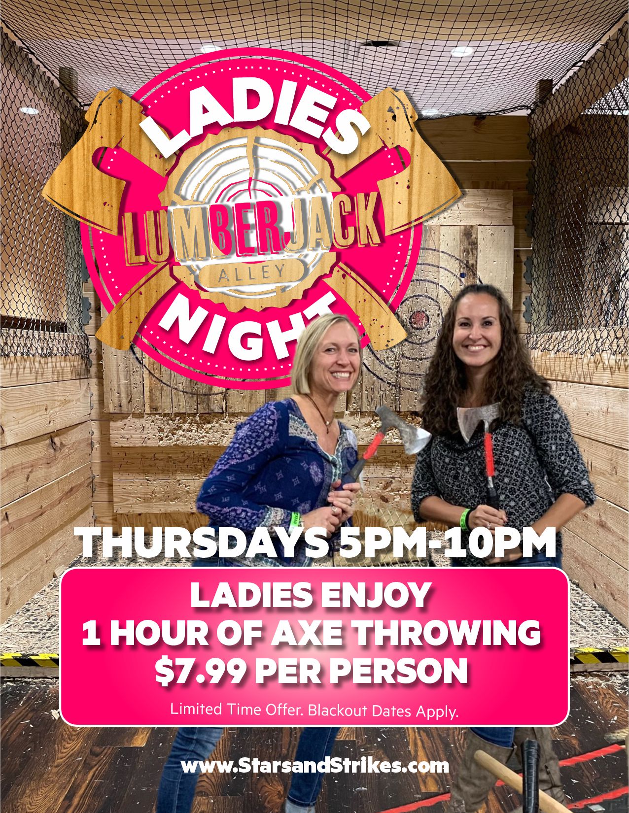 Ladies enjoy 1 Hour of Axe Throwing for $7.99 per person on Thursdays from 5pm to 10pm.
