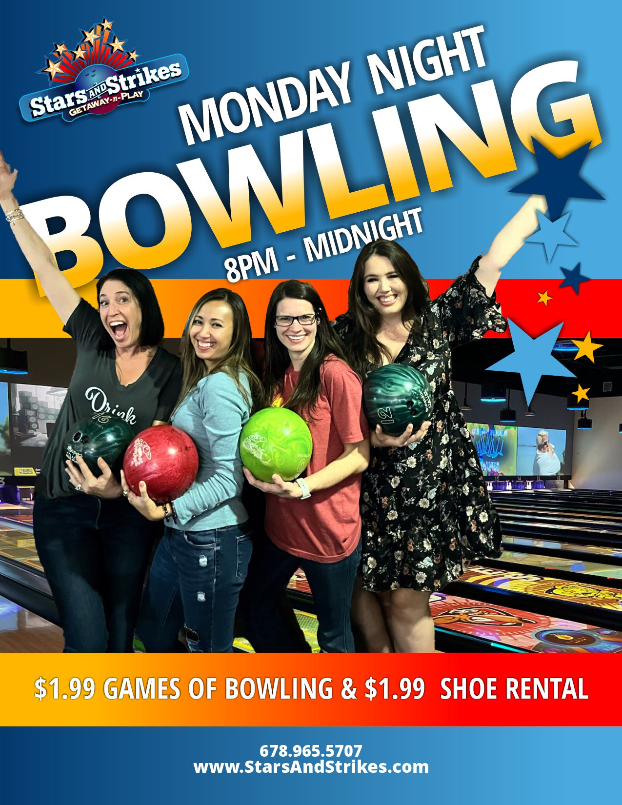 Enjoy $1.99 games of bowling and $1.99 shoe rental every Monday from 8pm until close!