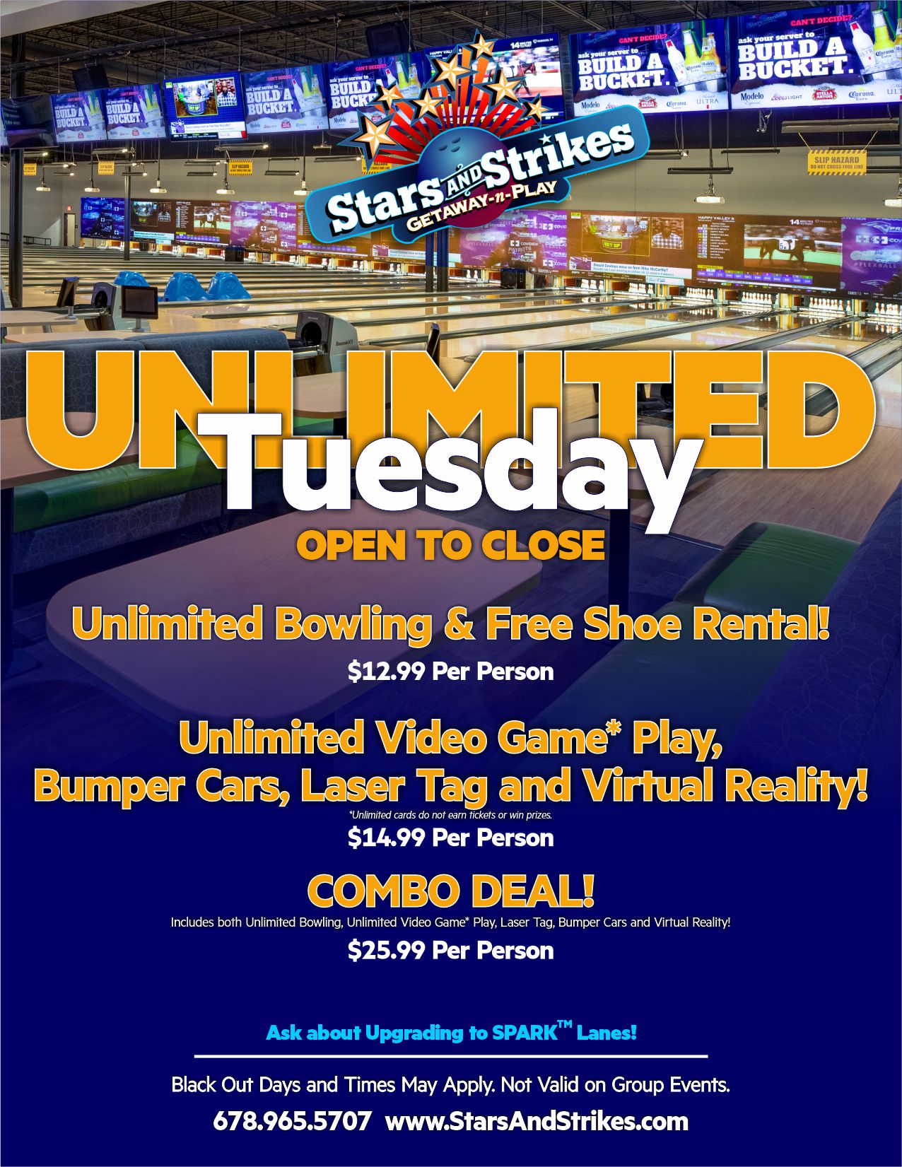 Due to limited lane availability, if you would like to reserve a lane please call us at (678) 965-5707 to pay the $15 lane reservation fee. Offer is not valid on Group Events.