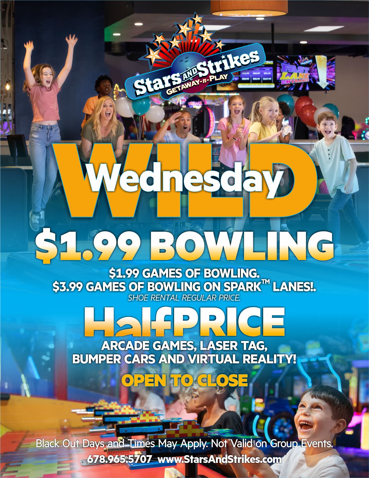 🎮 Half-Price Arcade Games, Laser Tag, Bumper Cars, & Virtual Reality — ALL DAY from open to close! 🙌
